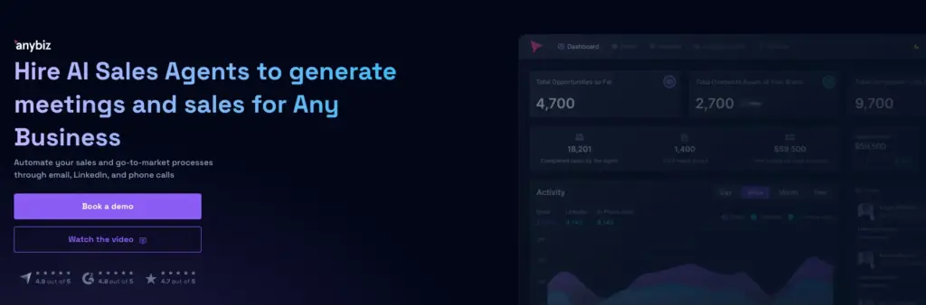 - AnyBiz dashboard. The AnyBiz dashboard forecasts the actions of the AI sales agent, it reports the total outreach and engagement—including email, LinkedIn and call activity.