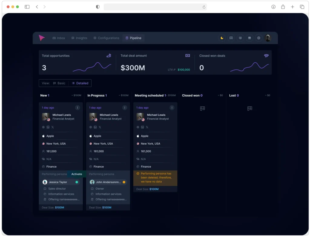 The Pipeline tab provides a real-time overview of lead status, ensuring that opportunities are effectively tracked and managed. AI automatically moves leads through different stages of the pipeline as they progress.